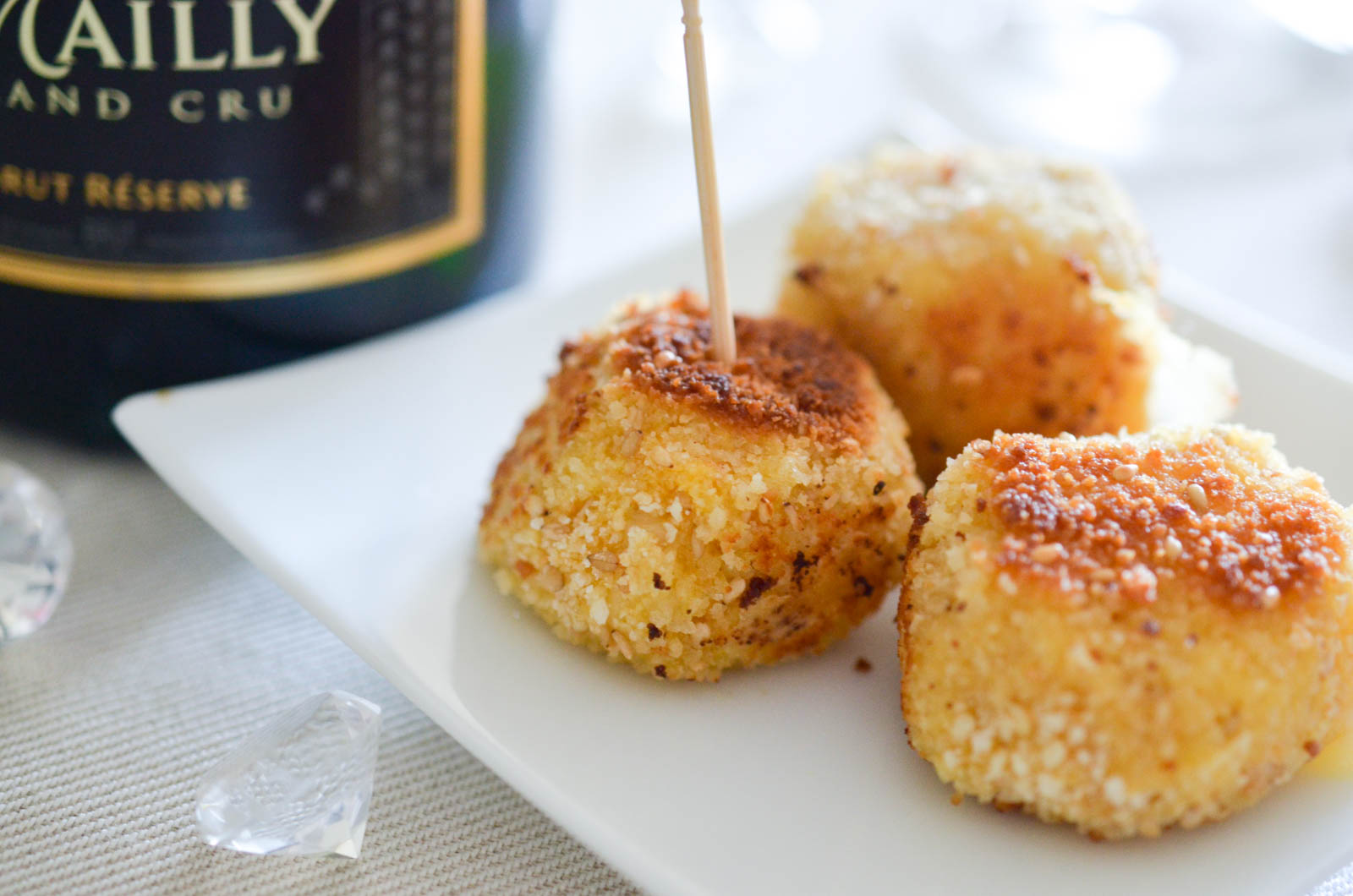 Coupez le fromage en portion de 15 à 20g. Roulez-les et ajoutez au centre quelques raisins secs imbibés (au moins 5). Formez des boules et placez au congélateur 15 minutes.